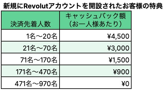 期間中に合計30,000円以上(消費税込)をクイック銀行チャージでチャージした上、その同額以上をRevolutカードを利用して決済いただいたお客様に、先着順で、決済されたタイミングに応じた額のキャッシュバックを進呈します(参加者がキャンペーン上限に達し次第終了)。