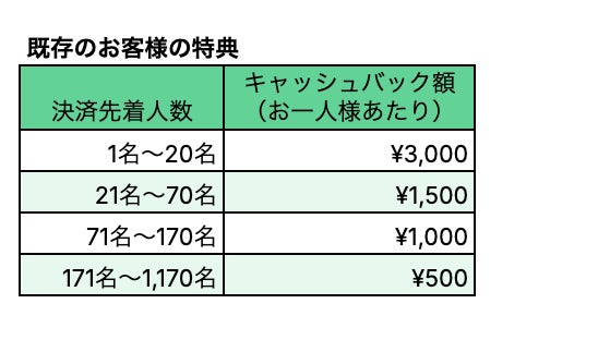 キャッシュバック額は、新規あるいは既存のお客様か、また決済されたタイミングに応じて異なります。(詳細は以下をご参照ください)