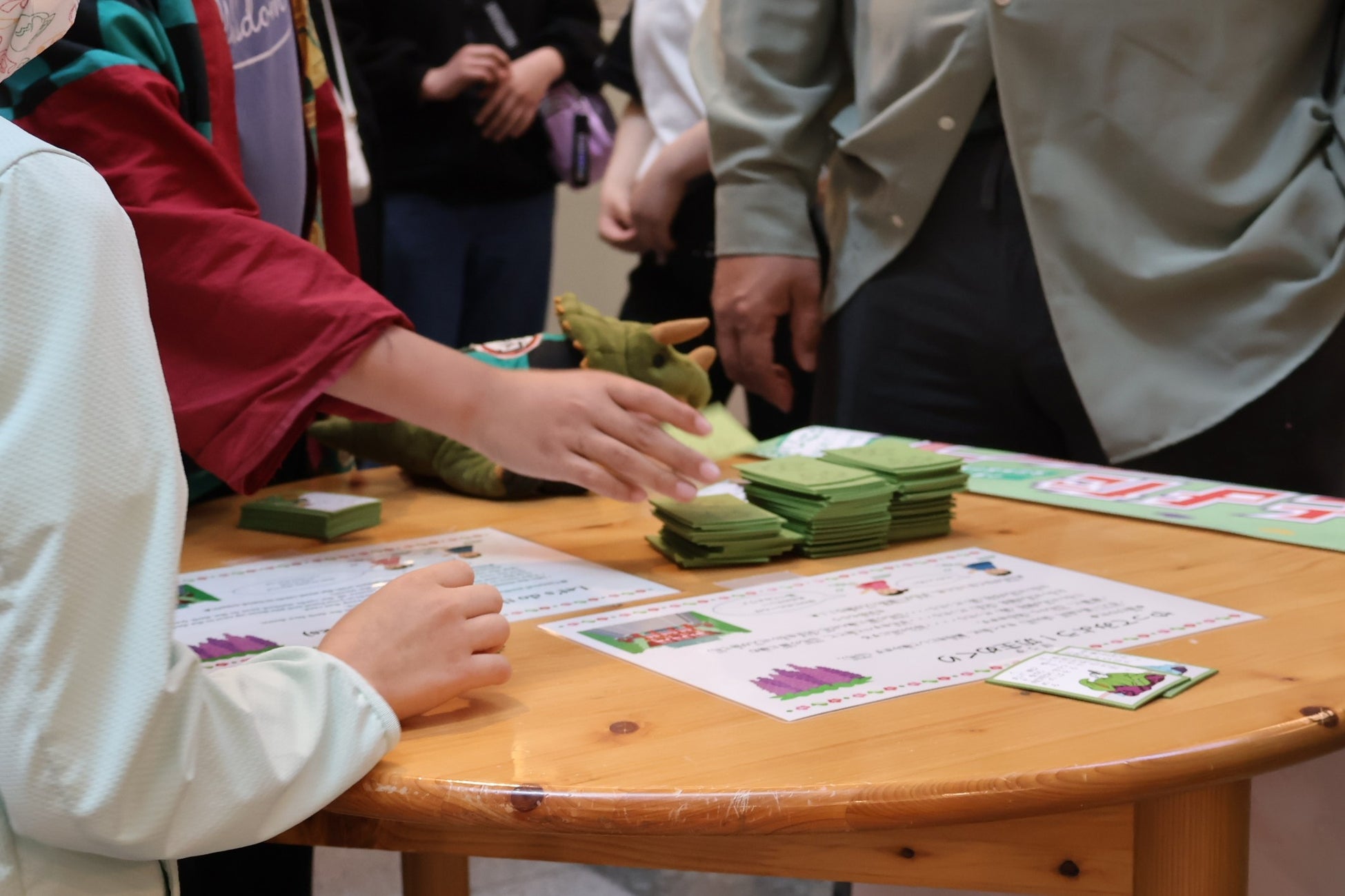 競技かるた選手のようにかっこよく札を払って、遠くまで飛ばそう!札が飛んだ距離に応じて、お菓子(参加賞)の数が増える!