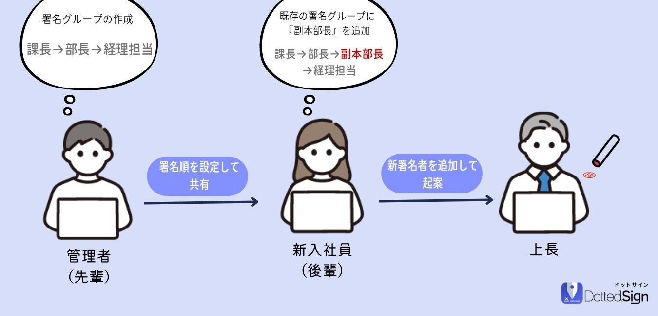 管理者が各項目に対しての署名グループを作成し、部内に共有できます。すべてのメンバーが既存の署名グループを活用できます。署名グループに新しいメンバーを追加した場合、追加されたメンバーには署名依頼が届きます。