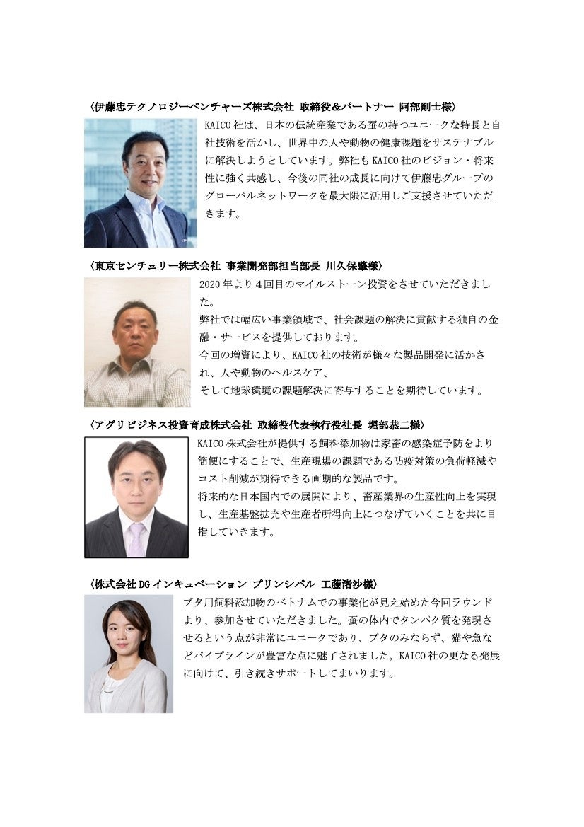 KAICO社は、日本の伝統産業である蚕の持つユニークな特長と自社技術を活かし、世界中の人や動物の健康課題をサステナブルに解決しようとしています。弊社もKAICO社のビジョン・将来性に強く共感し、今後の同社の成長に向けて伊藤忠グループのグローバルネットワークを最大限に活用しご支援させていただきます。