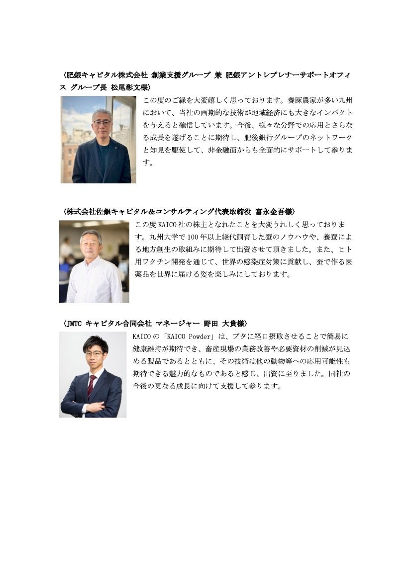 この度KAICO社の株主となれたことを大変うれしく思っております。九州大学で100年以上継代飼育した蚕のノウハウや、養蚕による地方創生の取組みに期待して出資させて頂きました。また、ヒト用ワクチン開発を通じて、世界の感染症対策に貢献し、蚕で作る医薬品を世界に届ける姿を楽しみにしております。