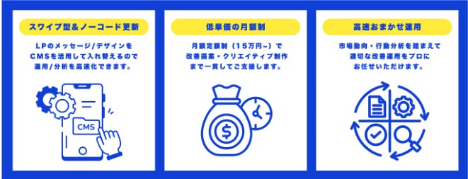 「LPワークス」はスワイプ型&ノーコードで更新できるCMSを活用し、クリエイティブやメッセージの入れ替えを容易にすることで、低単価の月額制プランで改善・運用を高速でおこなう体制を両立しました。