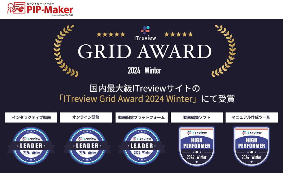 『PIP-Maker』、ITreview Grid Award 2024 Winterの「インタラクティブ動画部門」「オンライン研修部門」「動画配信プラットフォーム」の3部門で『Leader』を受賞。