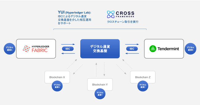 本デジタル通貨交換基盤の構築には、検証を代替するモジュールであるIBC Proxy、各検証モジュールとしてHyperledger Lab YUI、各ブロックチェーンとハブ間の通信プロトコルにIBC(*2)、クロスチェーン取引(ブロックチェーンをまたいだ複数の取引の同時実行)にCross Frameworkをそれぞれ用いています。