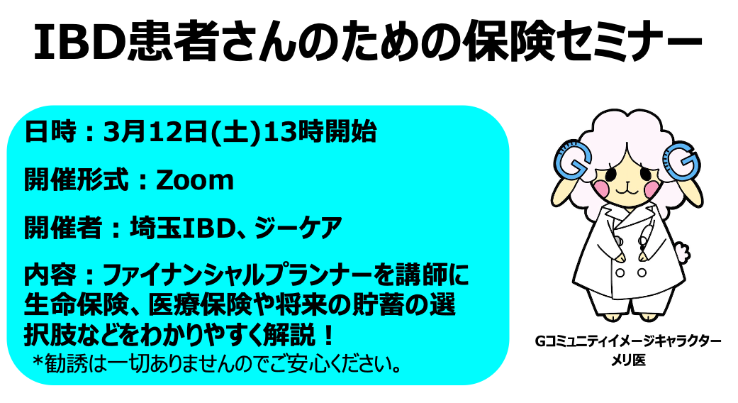 潰瘍性大腸炎・クローン病患者・ご家族ら向けオンラインイベント「IBD患者さんのための保険セミナー」を埼玉IBDの会とジーケアが開催