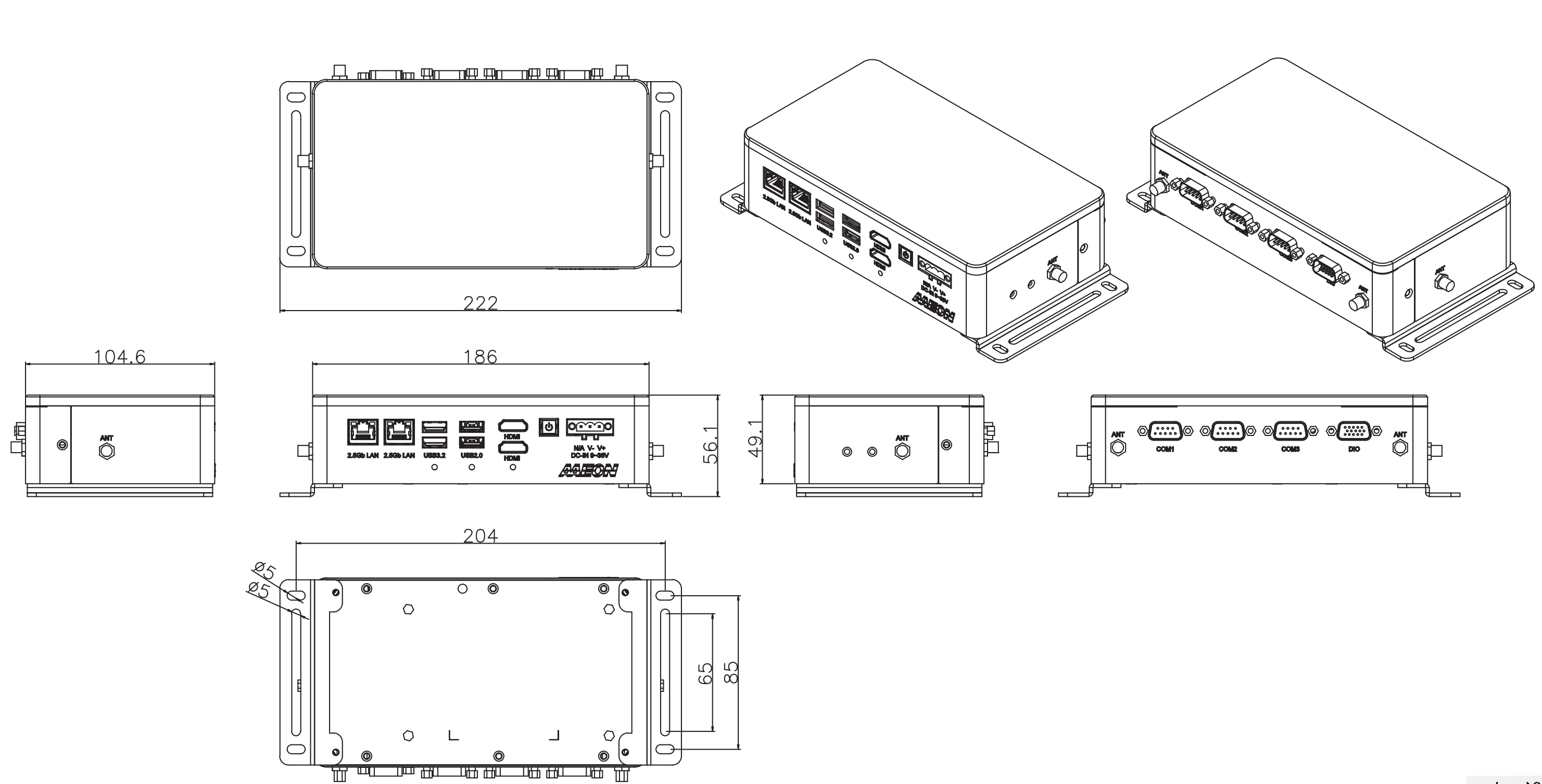 186x104.6x49.1mの小型サイズながら、RS-232/422/485×3、2.5GbE×2、USB3.0×2、USB2.0×2、HDMI×2、8ビットDIOなど豊富なI/Oを搭載し、9 ~ 36V DC入力対応製品となります。