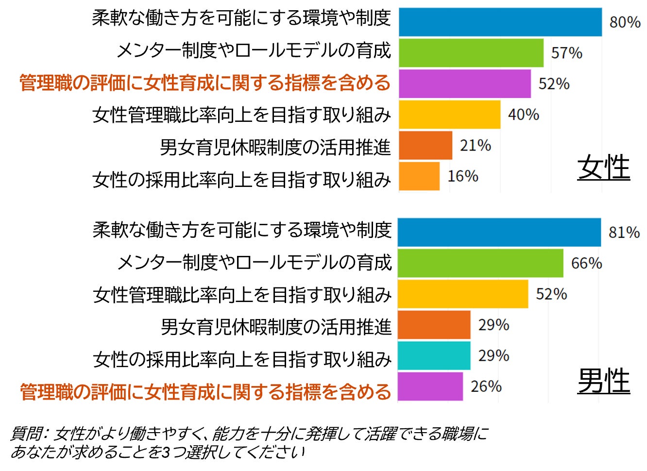 職場に求めることへの男女差: 現状ではまだ多くの組織が取り入れていない「管理職の評価に女性育成に関する指標を含める」ことを求める女性は52%、男性は26%