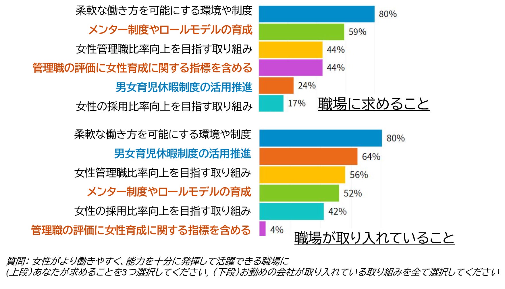 求める制度と現状にはギャップ: 多くの企業が導入する「男女育児休暇制度の活用推進」よりも、「メンター制度やロールモデルの育成」や「管理職の評価に女性育成に関する指標を含める」ことを求める声が上回る