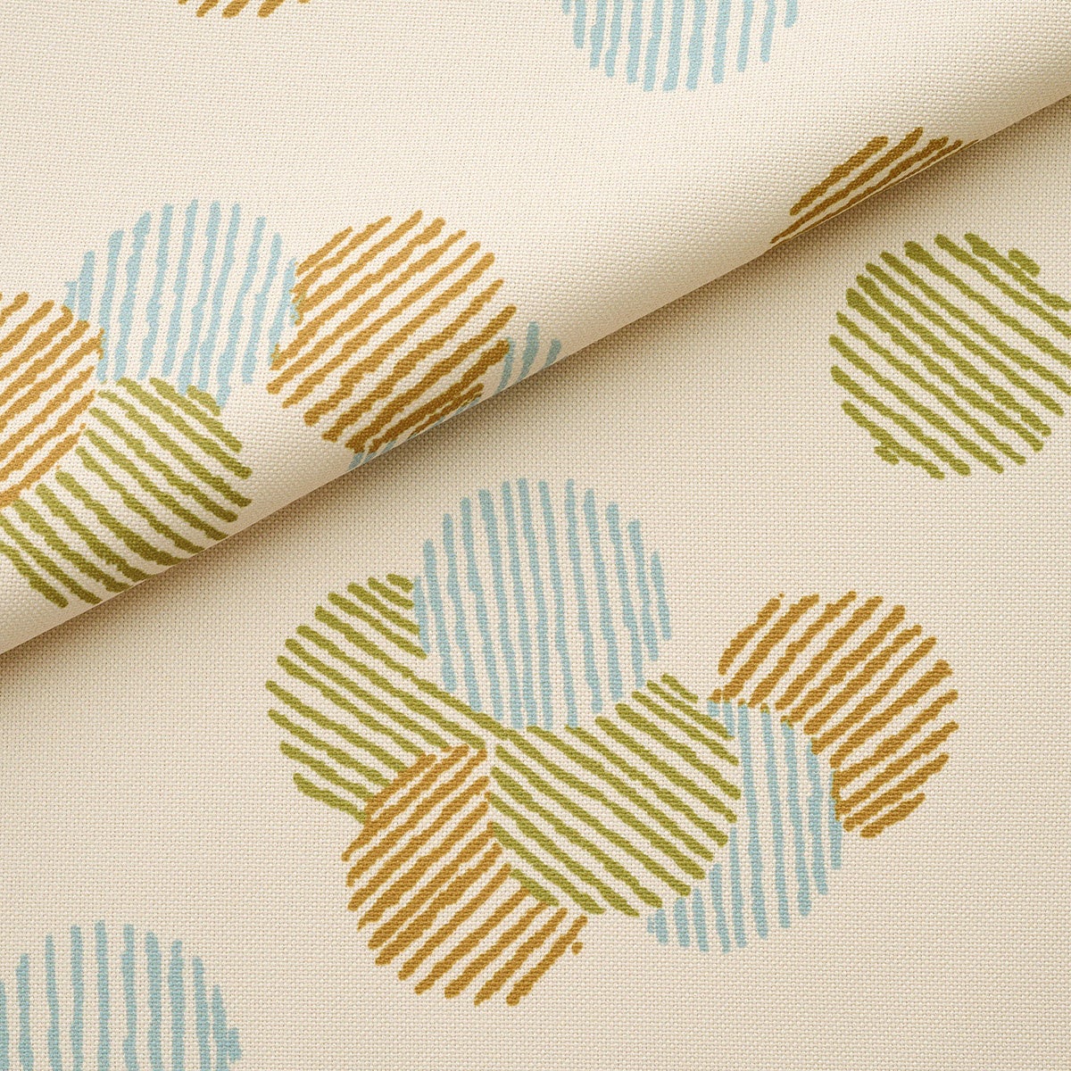 揺らぎのある線によって描かれたドット模様の生地は、色と線の方向が違うドットがあちらこちらに広がって、パーティーで使うコンフェッティ(紙吹雪)のように見えて、楽しくワクワクするデザインです。