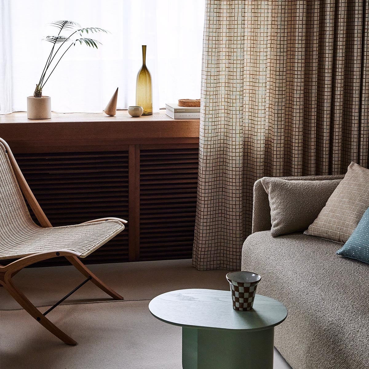 デザイン性の高いファブリックで、1cm単位で注文可能なオーダーカーテン、既製サイズから選べるクッションとテーブルクロス、そして100cm以上10cm単位にて生地をご注文いただけます。