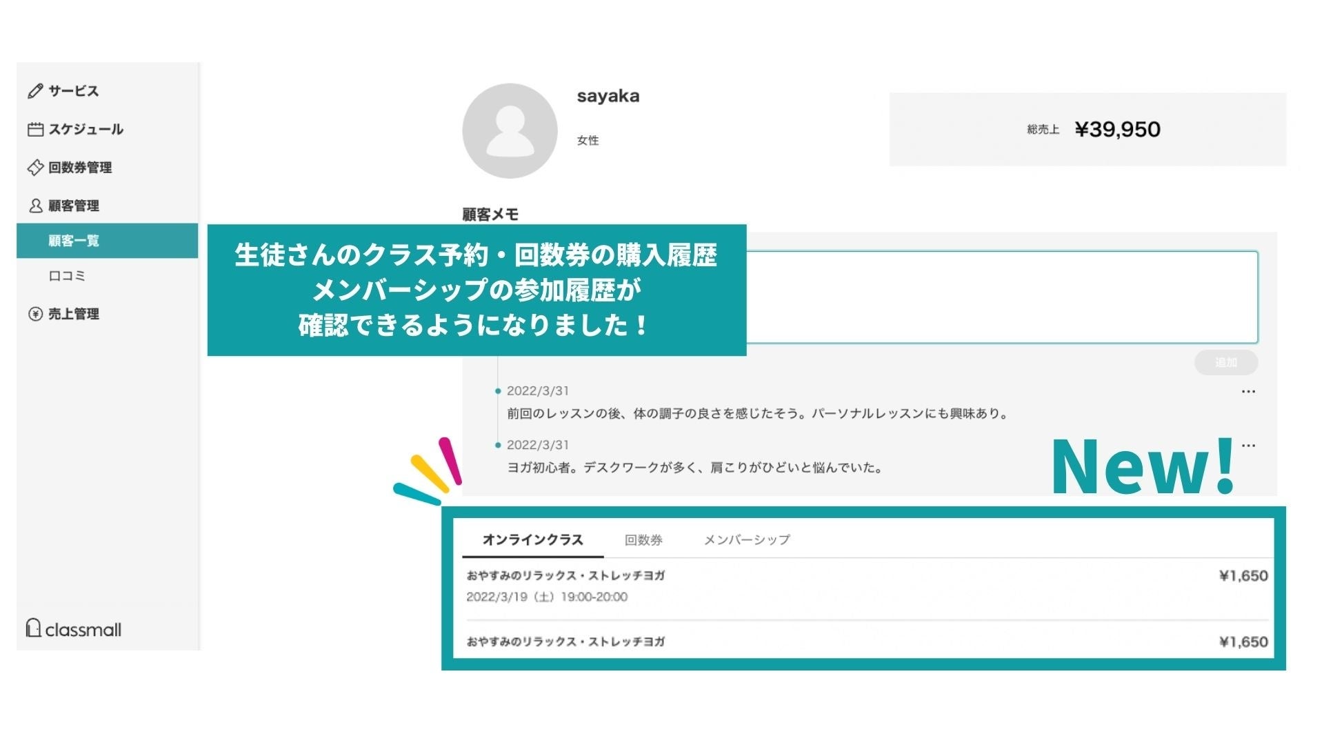 このような背景を踏まえ、classmallでは本日「顧客詳細機能」をリリースしました。現在classmallで提供可能なオンラインクラス、回数券、メンバーシップ、それぞれのサービスについて生徒さんの予約履歴を確認することができます。
