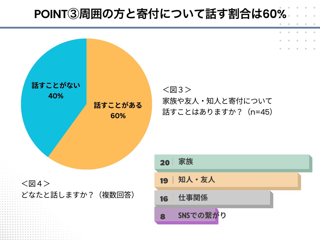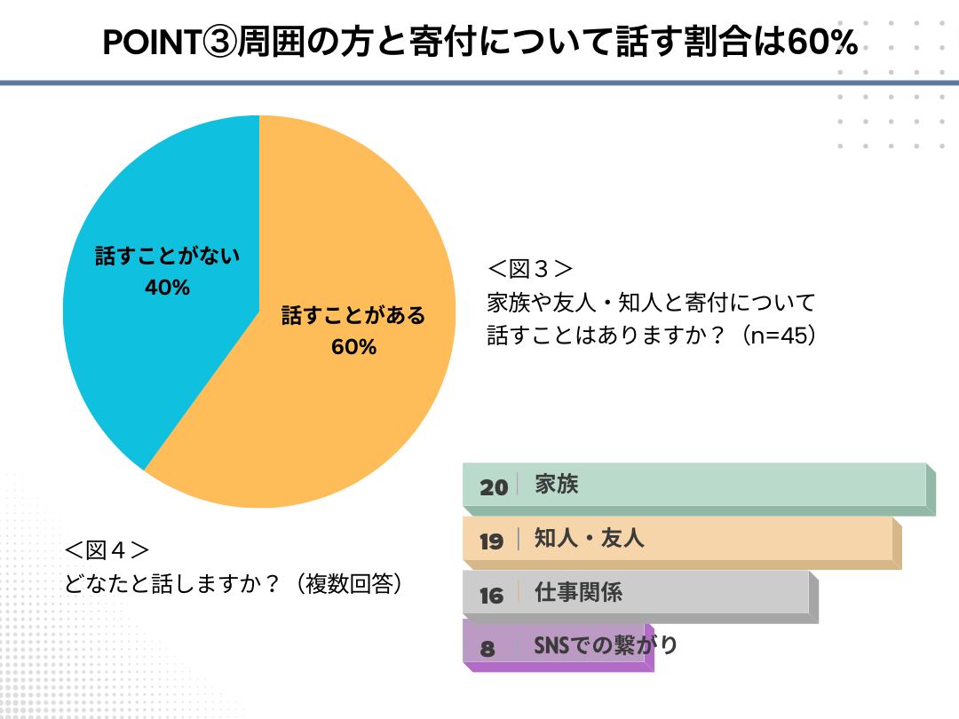 60%の方が「周りの方と寄付について話す機会がある」と回答。そして「誰と寄付について話すか」という質問には、ご家族のみならず、同じ程度の割合で友人・知人と、そして半数以上の方が仕事を通じて知り合った方とも「寄付」について話されています。