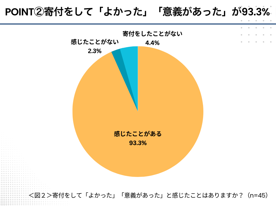 LFAに限らず、今までの寄付を振り返って「寄付してよかった・意義があった」と回答された方は、93.3%(その他感じたことがないが2.3% 、寄付したことがないが4.4%)。