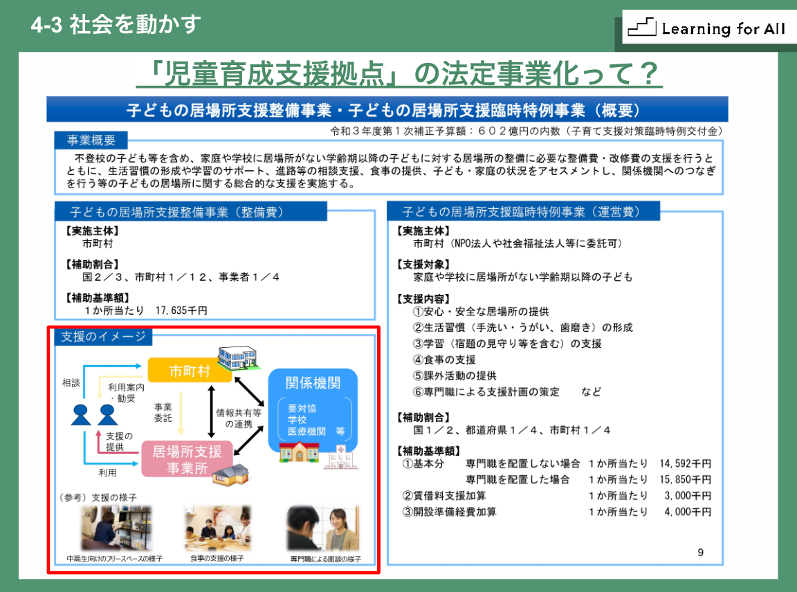 結果として、団体の居場所づくり事業がモデルとなった「児童育成支援拠点事業(※)」が法定事業化されました。他にも、拠点を展開している自治体(戸田市・つくば市)におけるアドバイザー就任や自主事業の行政事業化(板橋区)など、国や様々な自治体に実践を認めていただきました。