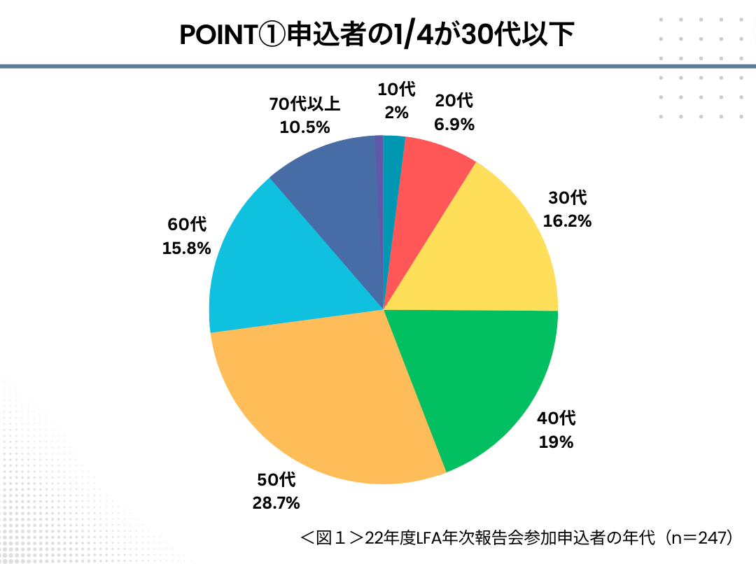 日本における個人寄付に関するデータを見ると、一度でも寄付をしたことがある割合は20代で25.5%、30代でも35.0%(出典:日本ファンドレイジング協会『寄付白書2021』)と、若い世代ではそう多くありません。そんな中で、今回のLFAの報告会の参加申込者の年齢の割合は30代以下が4分の1を占めており、若い世代でも、寄付やLFAの活動に関心を寄せてくださる層が一定数いらっしゃいます。