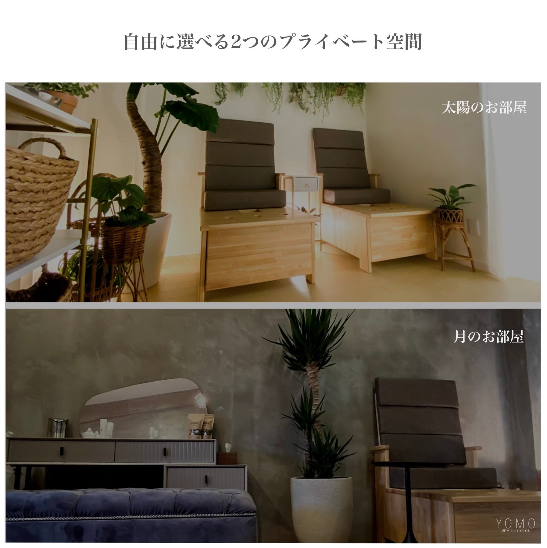 こだわりのプライベート空間「太陽のお部屋」と「月のお部屋」その日の気分に合わせてどちらも自由に選べる仕様に。