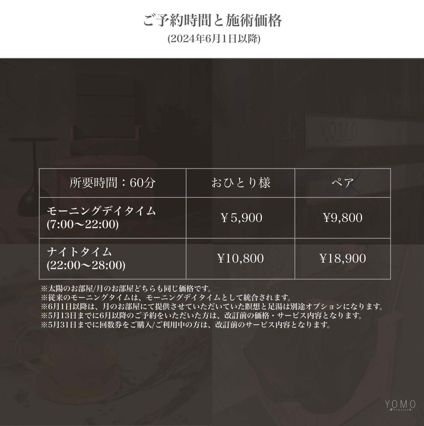 当初、ご新規のお客様は「太陽のお部屋」のみのご予約が可能であったところを、6月1日より「月のお部屋」もお選びいただけるようリニューアル。朝昼夜の各時間帯で、それぞれのライフスタイルに合わせて通っていただきやすい仕様に。お部屋はご予約時に選択可能。