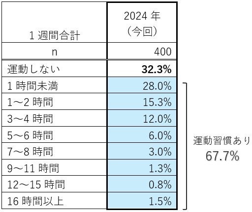 “人生100年時代”に向けて健康に対する意識が高まっていますが、実際に運動習慣のある人は7割近く(67.7%)いることが分かりました。1週間の運動時間は、「1時間未満」(28.0%)もしくは「1~2時間」(15.3%)のようです。