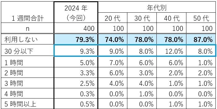 昨年2023年はまさに「生成AI元年」と言える年となり、一般の間でも急速に利用が広がりました。今後ますます生活ツールとして定着することが期待されますが、現在プライベートで利用しているのは全体の2割(20.7%)で、1週間で使う時間は「30分以下」(9.3%)でした。利用者は20代が最も多く、「4人に1人」(26.0%)が利用しているようです。