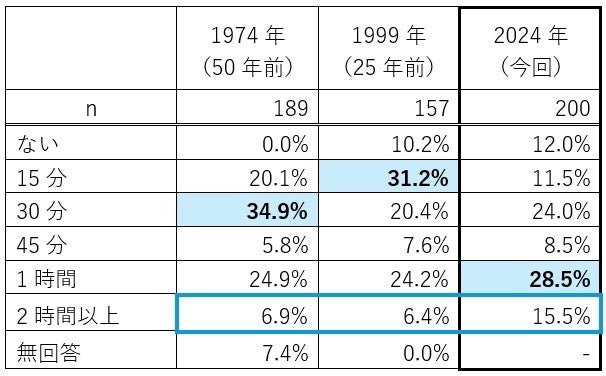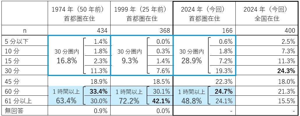 これを過去の調査と同様に、対象を首都圏在住者(166名)に限定すると、「60分」(24.7%)が最も多く、次いで「61分以上」(24.1%)となりました。「1時間以上」かけて通勤する人は約半数(48.8%)いますが、50年前の約6割(63.4%)、25年前の約7割(72.2%)と比べて減少しています。