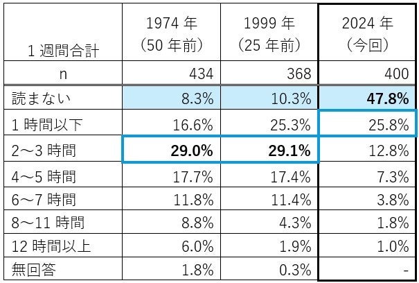 読む時間を見ると、25年前までは約3割の人が1週間に「2~3時間」でしたが、今では読んでも「1時間以下」(25.8%)と、この50年で読書時間は大きく減少しました。電子書籍の登場で何冊でも本が持ち歩けるようになったものの、スマートフォンの普及などによって時間の使い方が大きく変わっているようです。