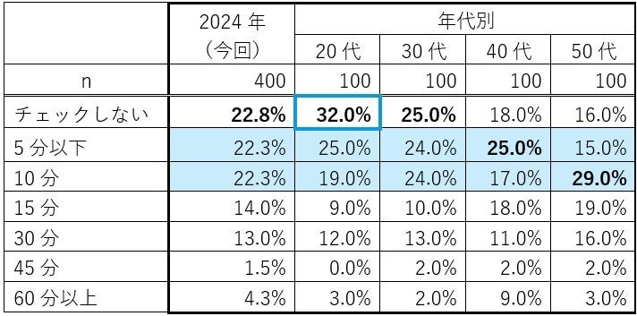 経済や社会の動きを知ることはビジネスのさまざまなシーンで役立ちます。そこで、出社前にニュースチェックにかける時間を聞いたところ、最も多かったのは「チェックしない」(22.8%)で、20代では3割(32.0%)を占めました。チェックしている人は「10分以内」が主流で、日々忙しいビジネスパーソンたちは効率よく必要な情報を収集しているようです。