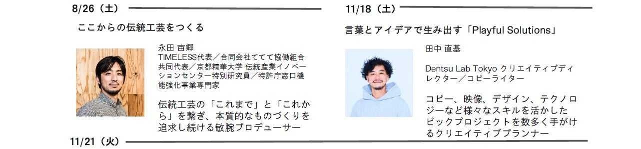 (左上から時計回りに)近藤哲朗(株式会社図解総研代表取締役)、豊田啓介(東京大学生産技術研究所特任教授、NOIZ、gluon)、山峰 潤也(キュレーター 株式会社NYAW代表取締役)、満永隆哉(HYTEK Inc. 代表取締役)、永田宙郷(TIMELESS代表、合同会社ててて協働組合 共同代表、京都精華大学 伝統産業イノベーションセンター特別研究員、 特許庁窓口機能強化事業専門家)、田中直基(Dentsu Lab Tokyo クリエイティブディレクター、コピーライター)乃村隆介(乃村工藝社 プランナー、クリエイティブディレクター)、ジュディ・ドビアス(Boquan Founder)、本間 貴裕(Sanu.Inc Founder Brand Director)、田中 元子(株式会社グランドレベル代表取締役)