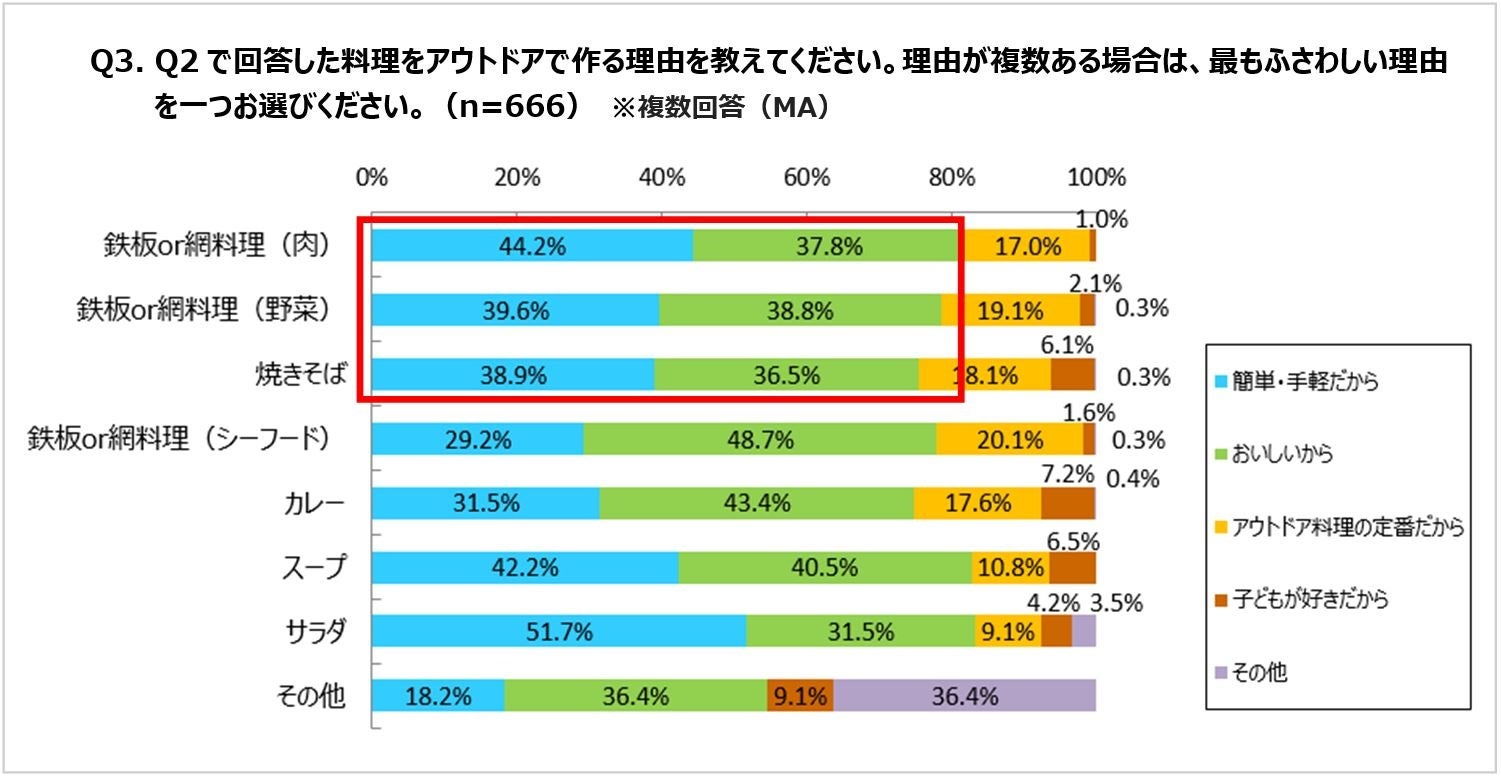 Q2. で回答した料理をアウトドアで作る理由を伺ったところ、上位である「肉(鉄板or網焼)」「野菜(鉄板or網焼)」「焼きそば」は、いずれも「簡単・手軽」という回答と「おいしい」からという回答が比較的バランスよく出ましたが、続く「シーフード(鉄板or網焼)」や「カレー」は「おいしい」という回答が「簡単・手軽」より圧倒的に傾向がみられました。この結果から、アウトドアでよく作る料理は、“手軽さ”と“おいしさ”の両方を重要視することがわかりました。