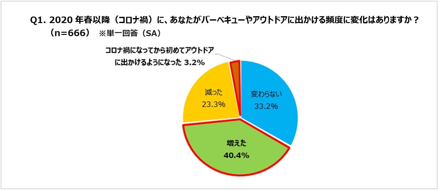 2020年春(コロナ禍)以降、バーベキューやアウトドアに出かける頻度に変化はあったかの質問に対し、40.4%の人が頻度が「増えた」と回答。また、「コロナ禍以降に初めてアウトドアに出かけるようになった」という方も、3.2%居ることがわかりました。バーベキューやアウトドアは、感染リスクの低い屋外で手軽に楽しめることから、コロナ禍であっても、43.6%と約半数近くの人が、家族やお友達と体験する頻度が増えている傾向がみられました。