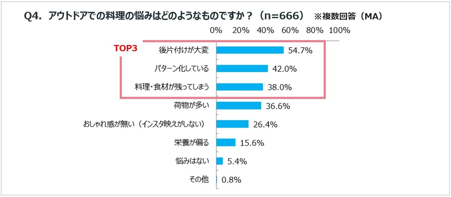 (4)一方、アウトドアでの料理の悩みは「後片付けが大変」(54.7%)、「パターン化している」(42.0%)、「料理・食材が残る」(38.0%)が上位に