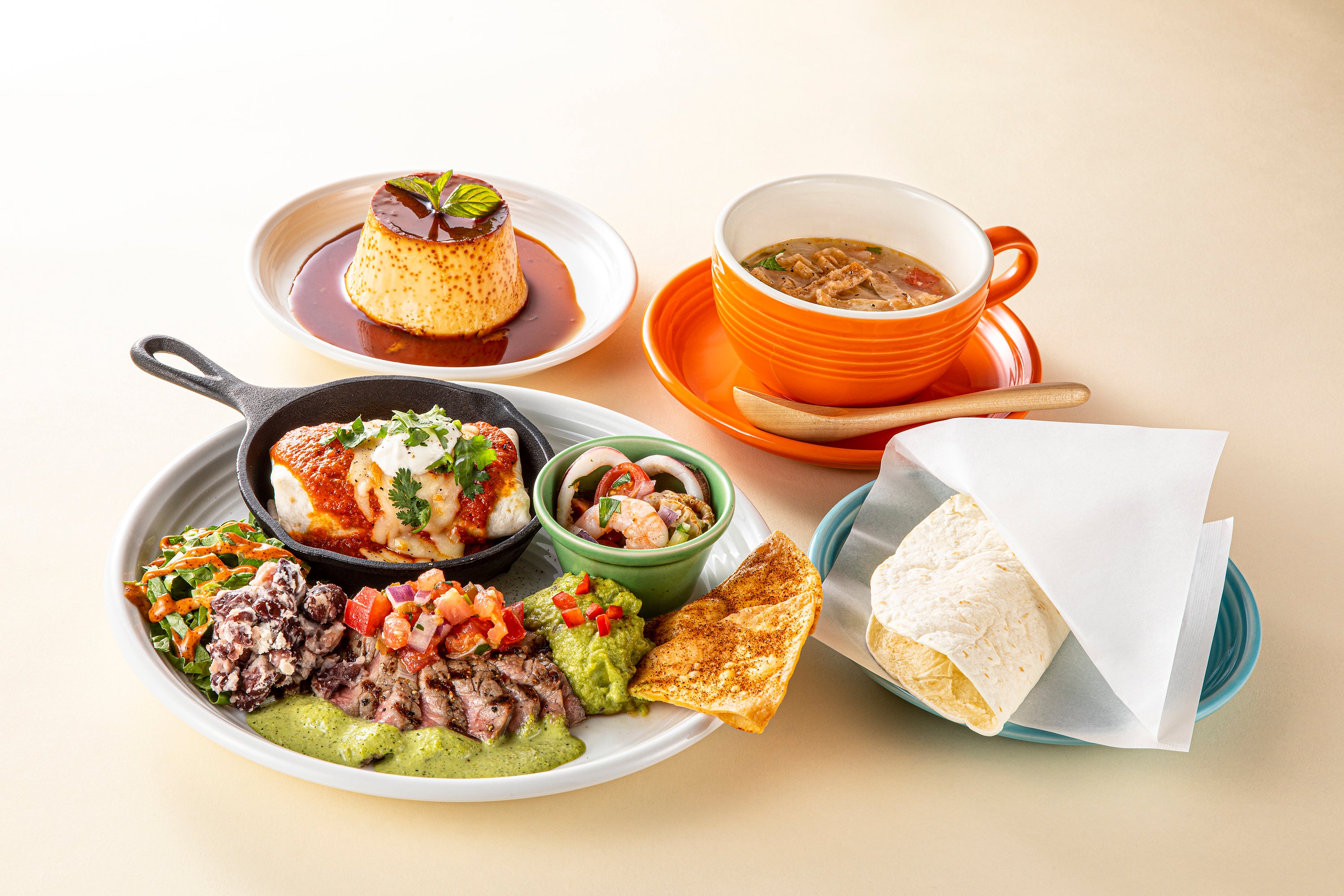 世界のパンで『HITOTEMA KITCHEN』プロジェクト第2弾は、メキシコの郷土料理をイメージしたワンプレートメニューを6月30日(日)の期間限定で好評販売中です。メキシコ料理の定番であるトルティーヤで蒸し鶏を包んだエンチラーダスをはじめ、メキシコ牛サーロインのグリル、ワカモレ(アボカドディップ)、インゲン豆のフリホレスなどボリューム満点のワンプレートです。セットのトルティーヤで具材をはさめばオリジナルメニューとしてもお楽しみいただけます。また、メキシコのフラン(プリン)をイメージし、プツプツと穴が空いた形が特徴のプリンもご用意。日本にいながらも、陽気な国メキシコの気分を満喫ください!