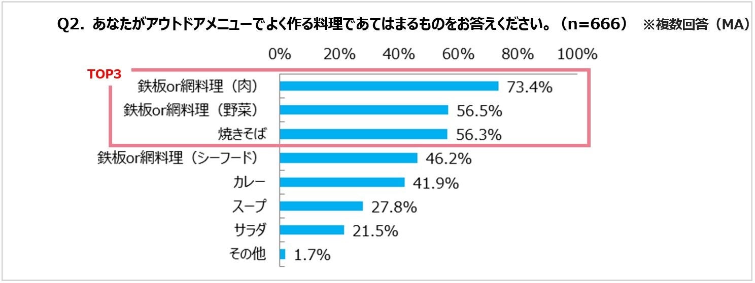 アウトドアでよく作る料理は「肉(鉄板or網焼)」が73.4%と圧倒的に多く、次いで「野菜(鉄板or網焼)」56.5%、「焼きそば」56.3%と続き、アウトドアの人気メニューが上位となりました。