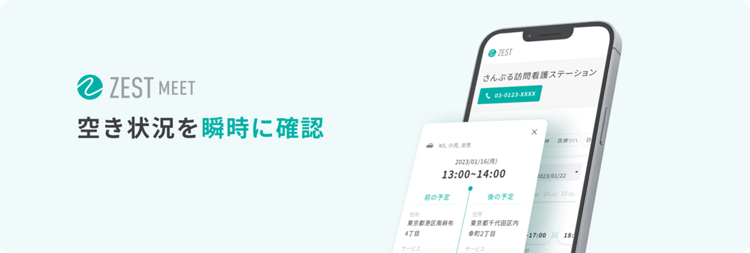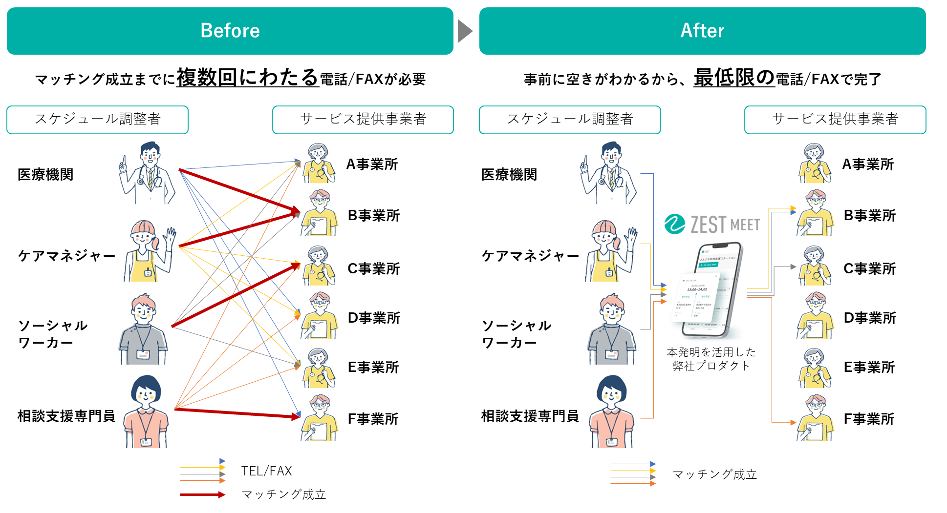 当社は「本発明」を活用し、『ZEST MEET』というプロダクトを展開しております。『ZEST MEET』を活用すれば、サービス提供事業所の “タイムリーな空きスケジュール”を共有可能なため、受入可能性の高い事業所にのみアプローチするだけでよくなり、調整にかかる工数を圧倒的に減らすことが可能です。
