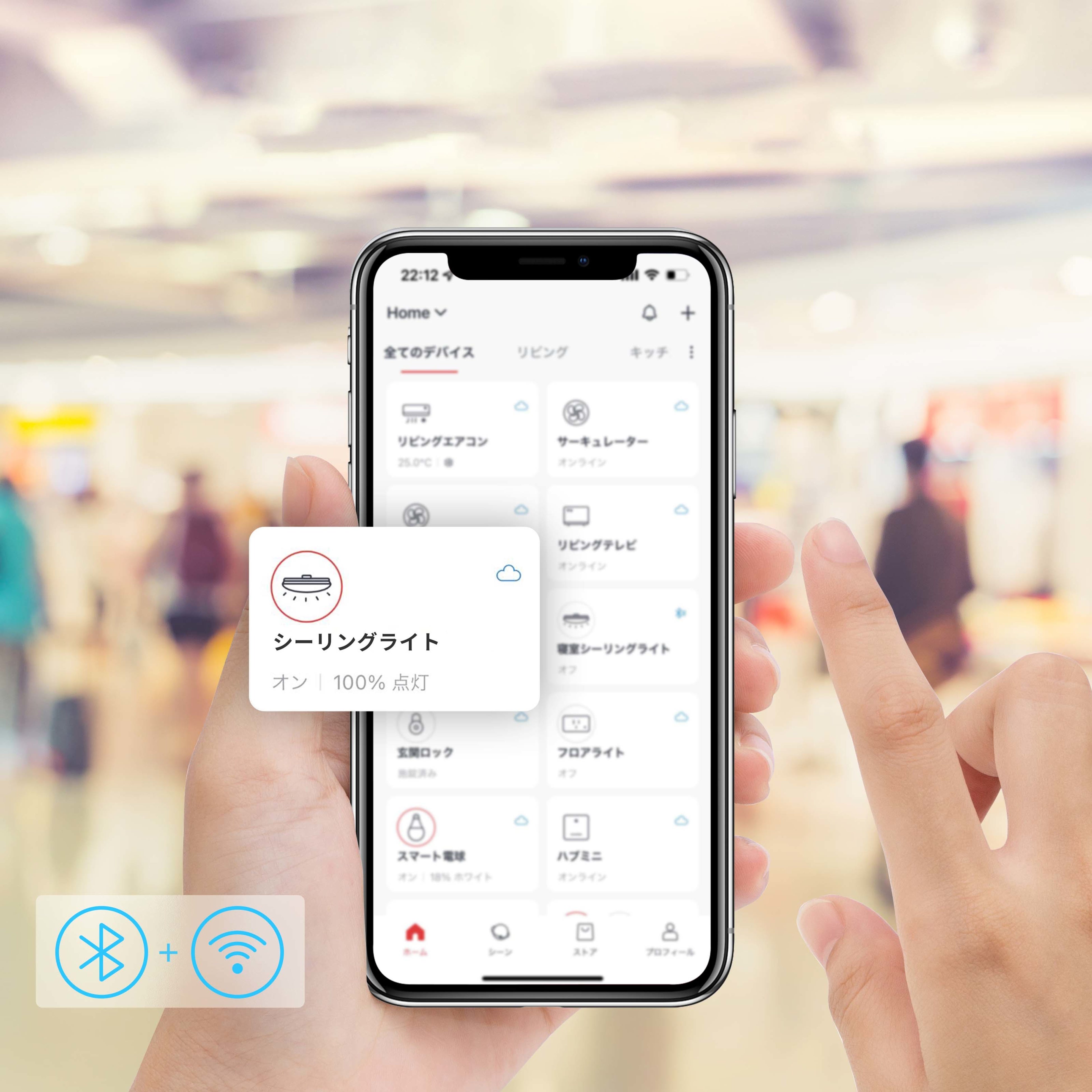 Wi-Fi、Bluetooth機能を搭載しており、通常のリモコン操作のほか、スマホアプリを通して遠隔操作ができます。さらにアレクサに「アレクサ、シーリングライトを消して」と声をかけることも可能。お好みに合わせて簡単に操作できます。明かりのオン/オフほか、明るさと色温度の調節も音声操作が可能。「声をかけるだけ」で照明を操作できる未来の生活を実現します。また、Google アシスタントやAlexaといった多くのサードパーティーサービスにも対応。(*対応可能なサードパーティーサービスの種類は同様の製品のなかでも高い充実度を誇る)