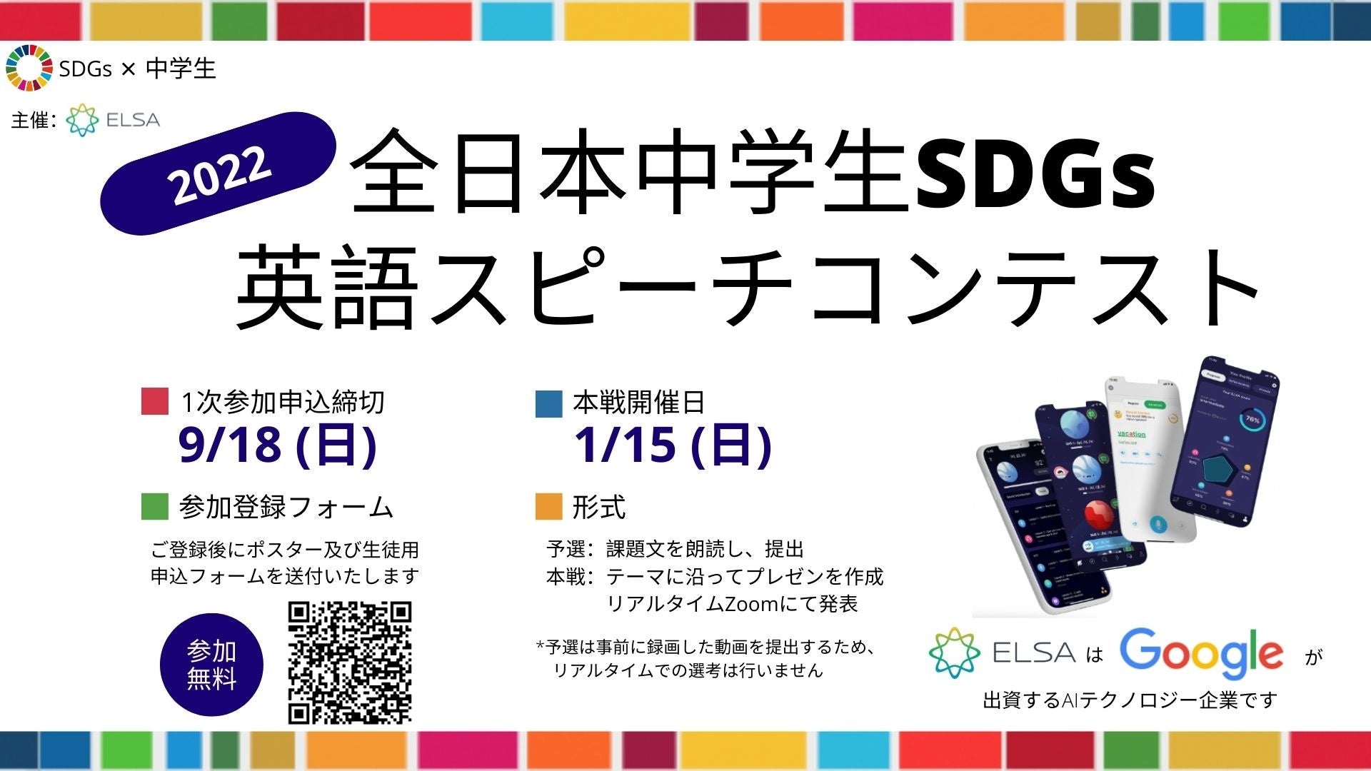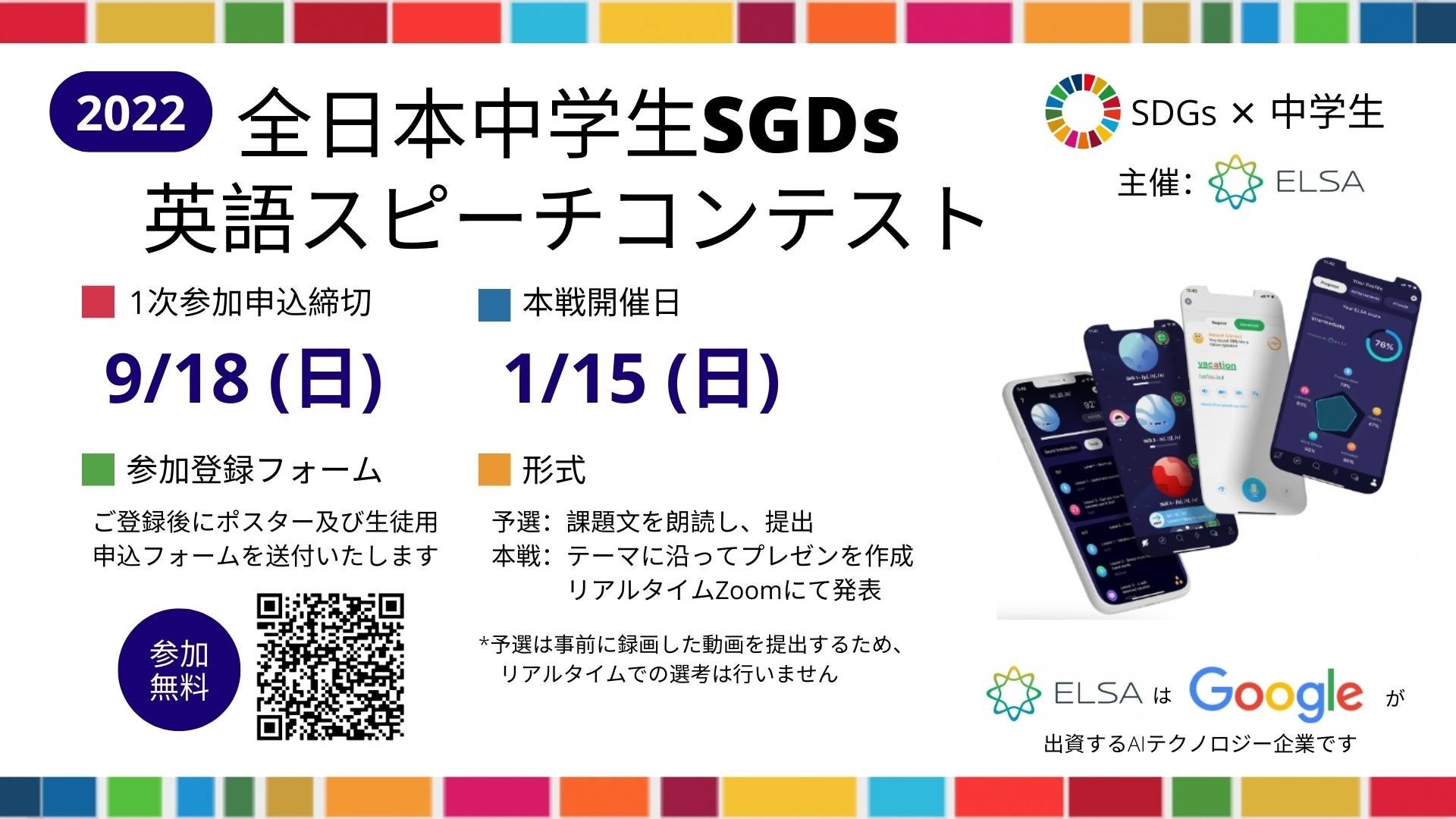 米国スタンフォード大学発のAI発音コーチアプリ"ELSA Speak"を開発するELSA Corp. (CEO: Vu Van)は、日本にいる中学生を対象とし、SDGsのテーマに沿ったスピーチコンテスト「全日本中学生SDGs英語スピーチコンテスト」を2022年1月15日(日)(予選12月4日)に開催致します。ご参加頂いた中学生は、"ELSA Speak" を無料で使用することができます。優勝賞与として、豪華景品をご用意しております。