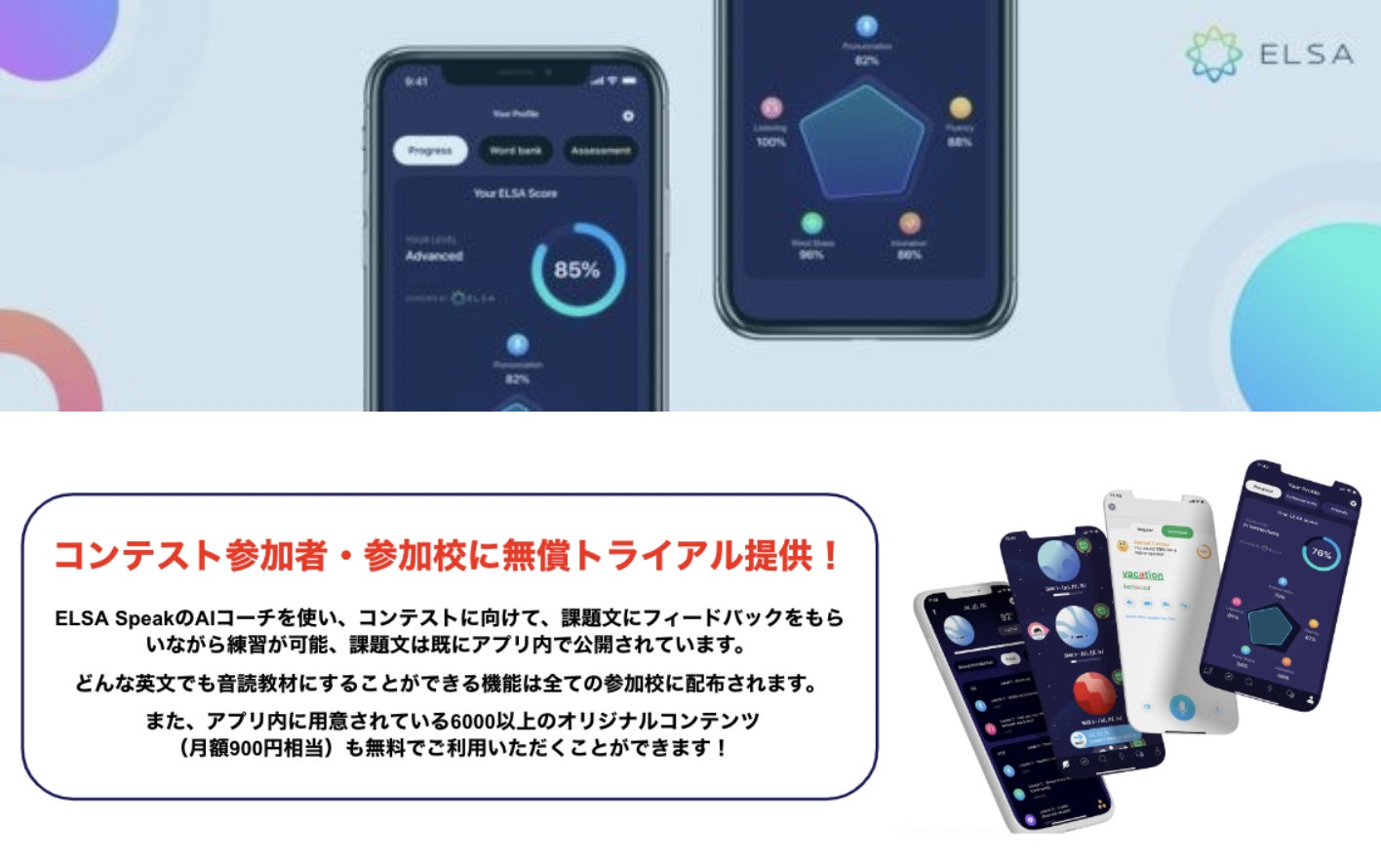 著名な審査員からのフィードバックもありながら、発音・流暢さ・イントネーションに関しては、日本初の取り組みとなる、ELSAのAIによる判定も考慮します。
