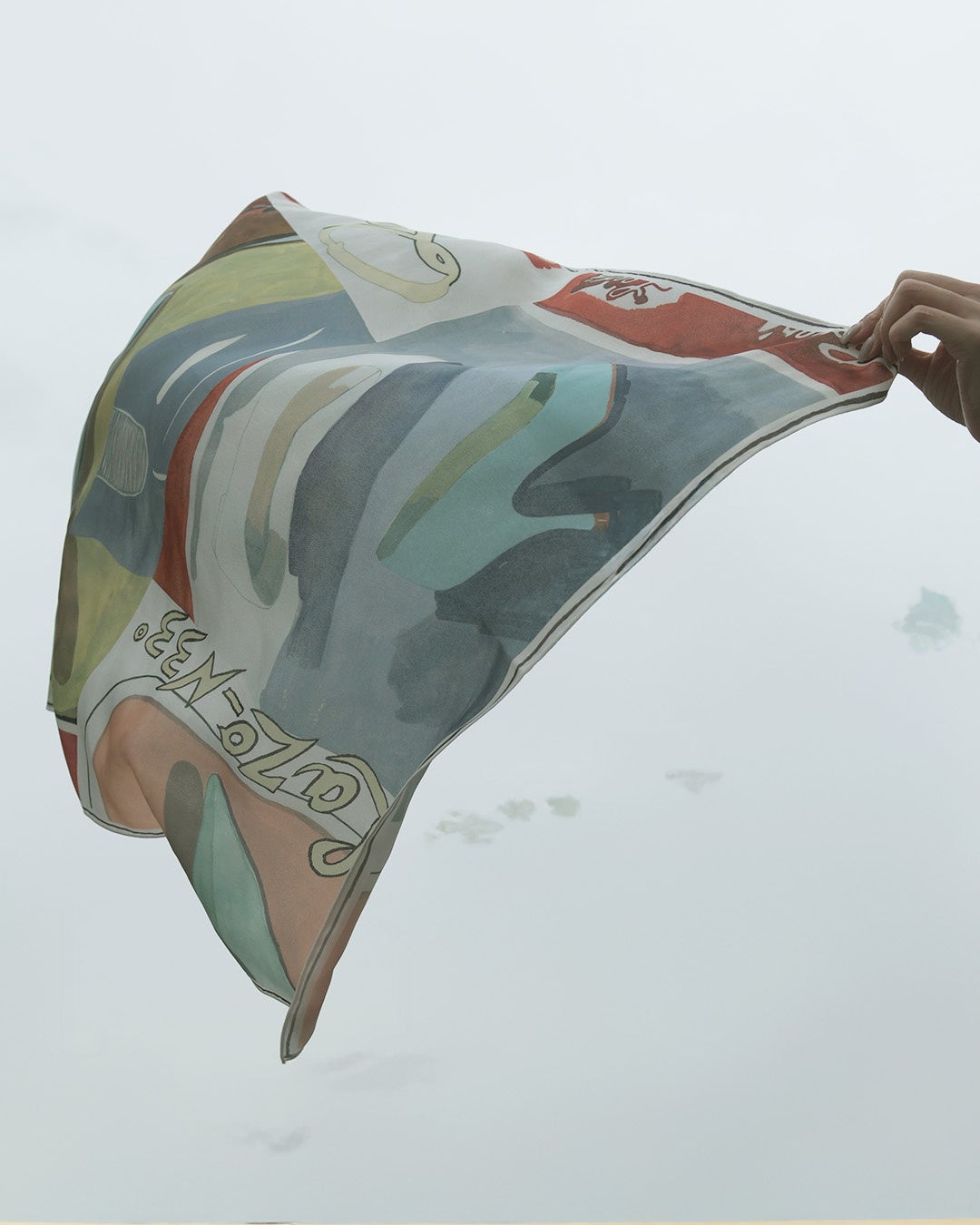 温かみのあるファッションアート。優しい水彩タッチとシックな色合いが、大人のエレガンスを引き立てるスカーフ。クラシックなハイヒールが描かれた、レトロモダンなアートワーク。