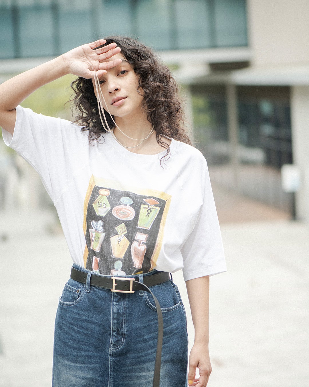 パフュームと遊び心のあるLazoのロゴを組み合わせた、カラフルなイラスト。 ちょっとした遊び心が散りばめられたTシャツは、身に着けるだけで不思議とワクワクし、コーディネートが楽しくなる一枚です。