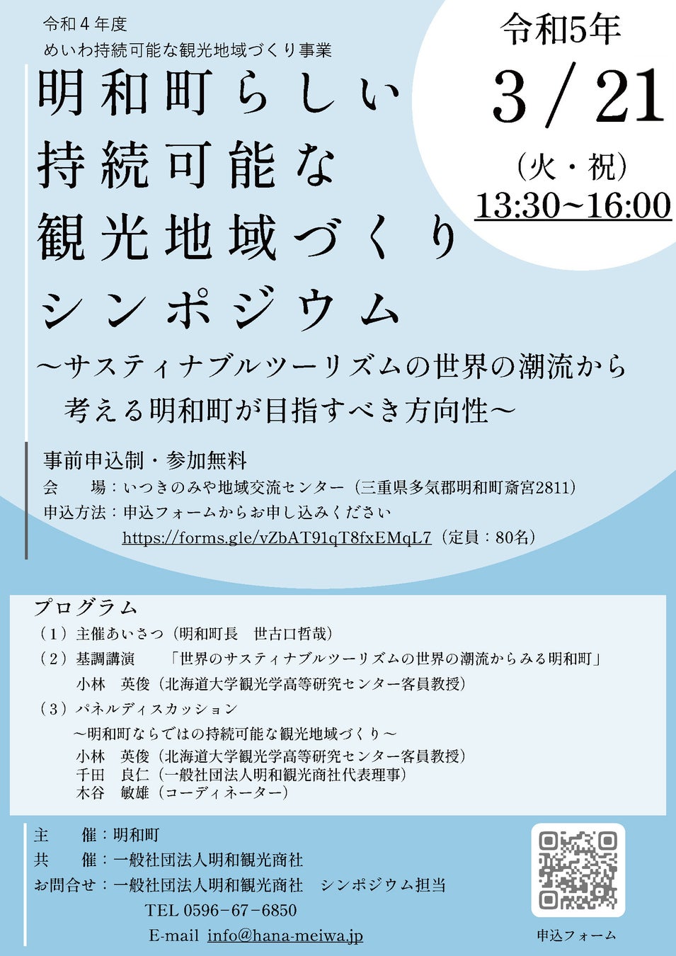 三重県・明和町と一般社団法人明和観光商社は、2023年3月21日(火・祝)13:30から、いつきのみや地域交流センターで、明和町の持続可能な観光地域づくりを考えるシンポジウムを開催いたします。