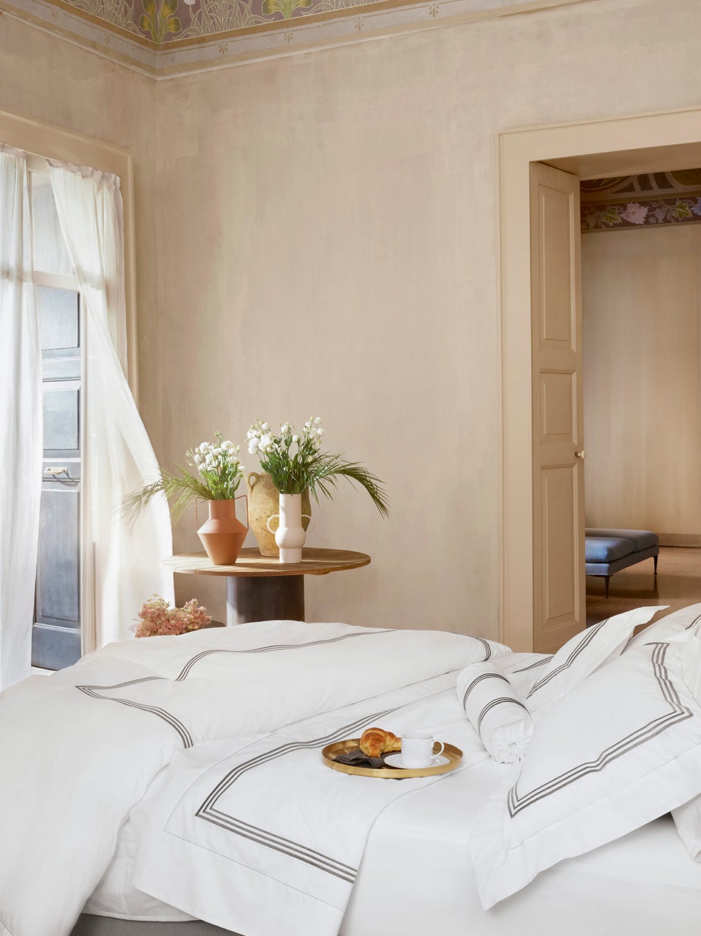 Treccia Collection:フィレンツェ建築の、螺旋状のレリーフで飾られた柱からインスピレーションを得たコレクション。エジプト綿を使用したパーケール生地に、熟練の職人が鮮やかなカラーリングの刺繍を施します。刺繍と同じカラーの美しいスカラップエッジが、上品さとあたたかみをもたらしています。