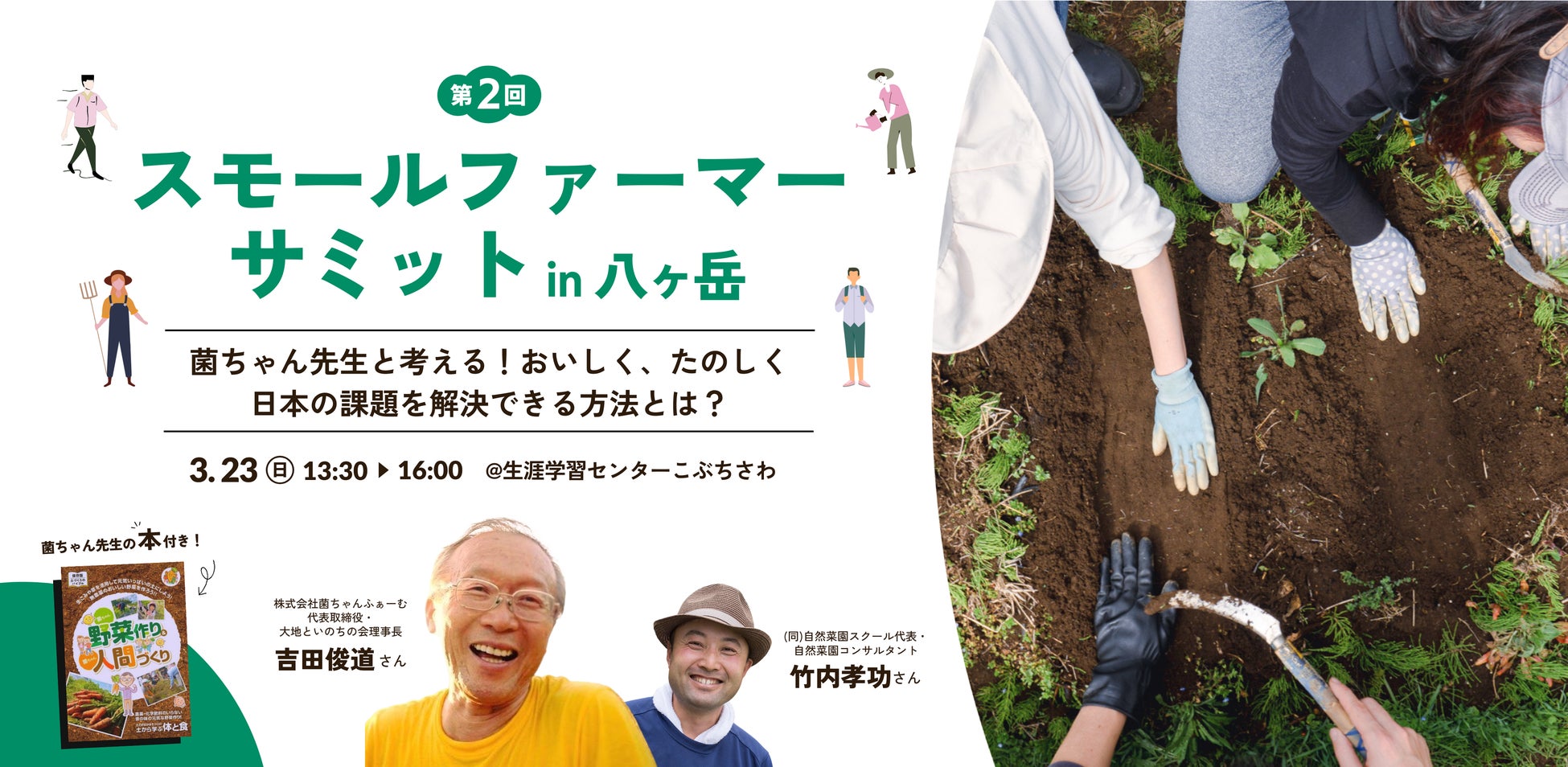 そして講演後のトークセッションでは、「無農薬・無化学肥料栽培で農的暮らしを本気でサポート」する自然菜園スクール主宰の竹内孝功さんをゲストとしてお迎えし、アイクリエイト代表の粟田あやとともに、日本が現在抱えている課題とそこに向けた個人ができることについてみなさんと考えていきます。