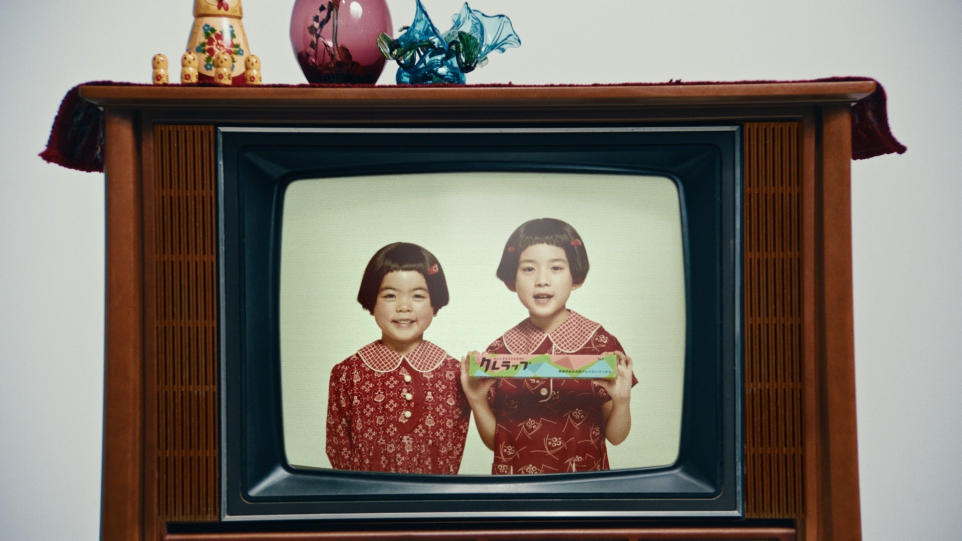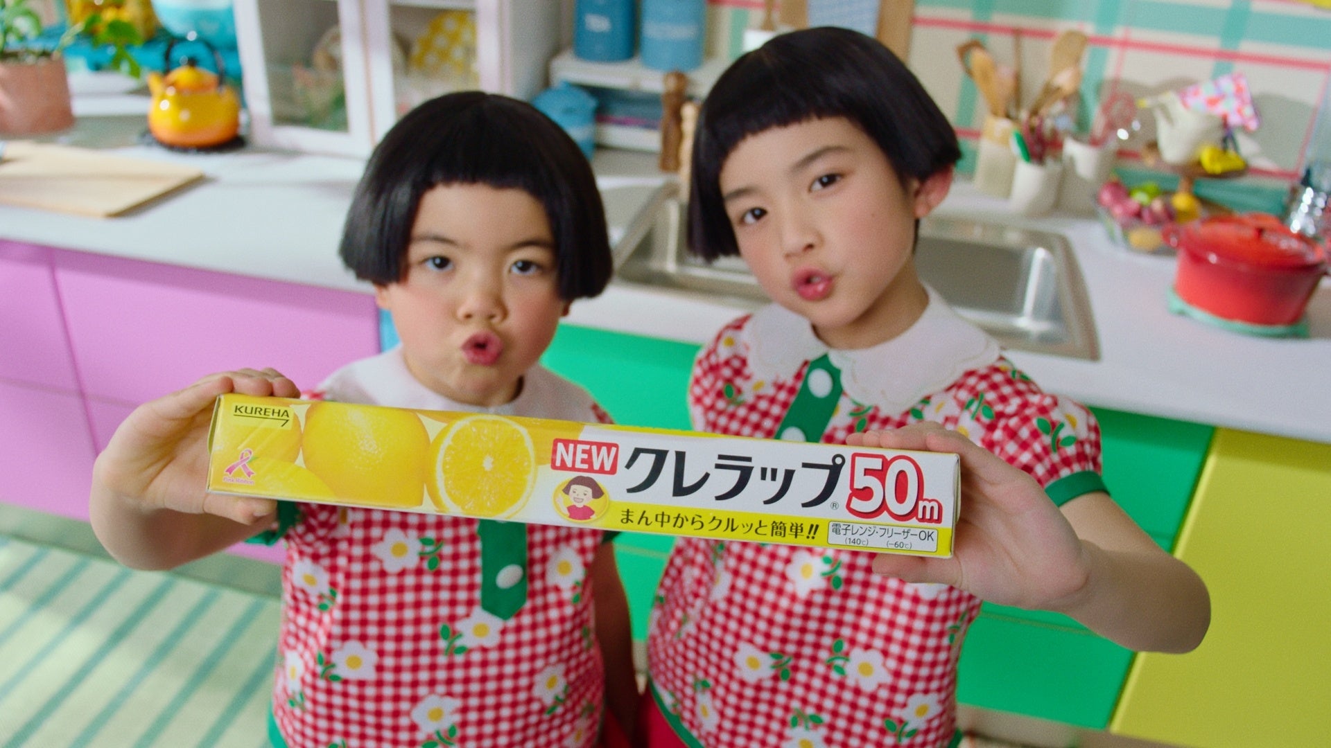 クレラップと同世代のカラーテレビに映し出された、クルリとクルミ。 初代クレラップを手に「日本初の家庭用ラップ」であることを紹介すると…次の瞬間!テレビの後ろからぴょん!と飛び出し現代の世界へ。 キッチンに移ると、そこには歴代のクレラップが。