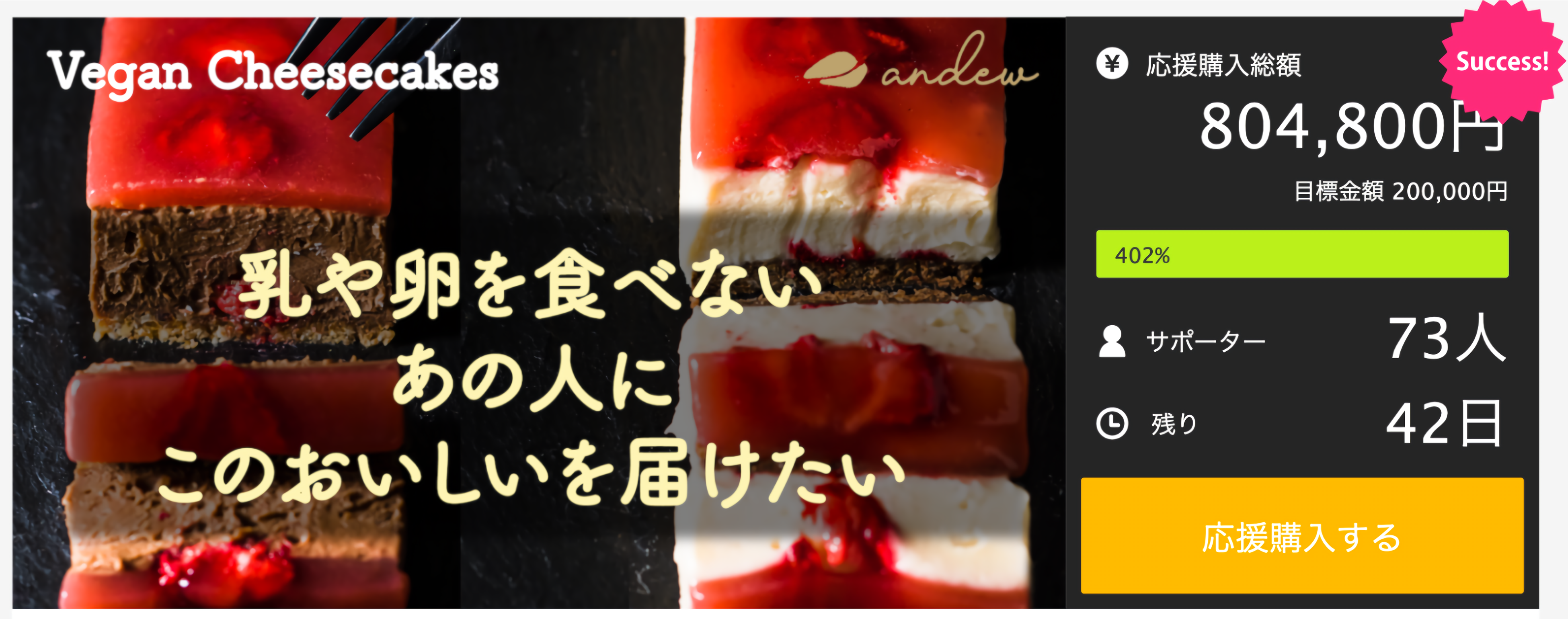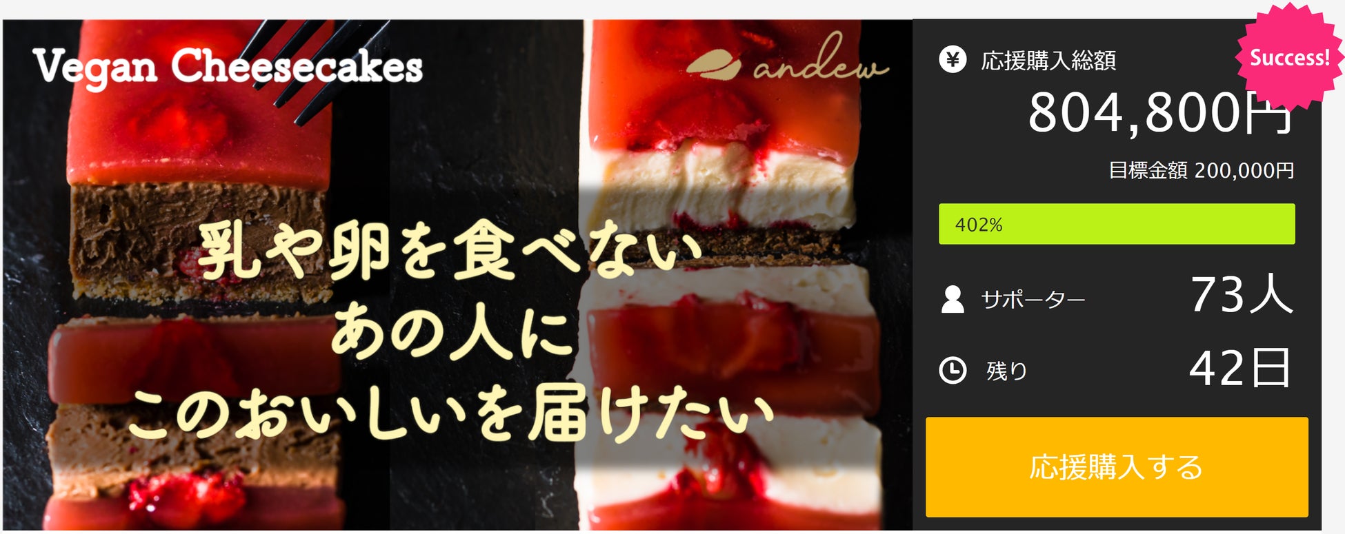 応援達成率400%超!現役医学生が創ったandewが初めてのヴィーガンチーズケーキをMakuakeにて限定販売中
