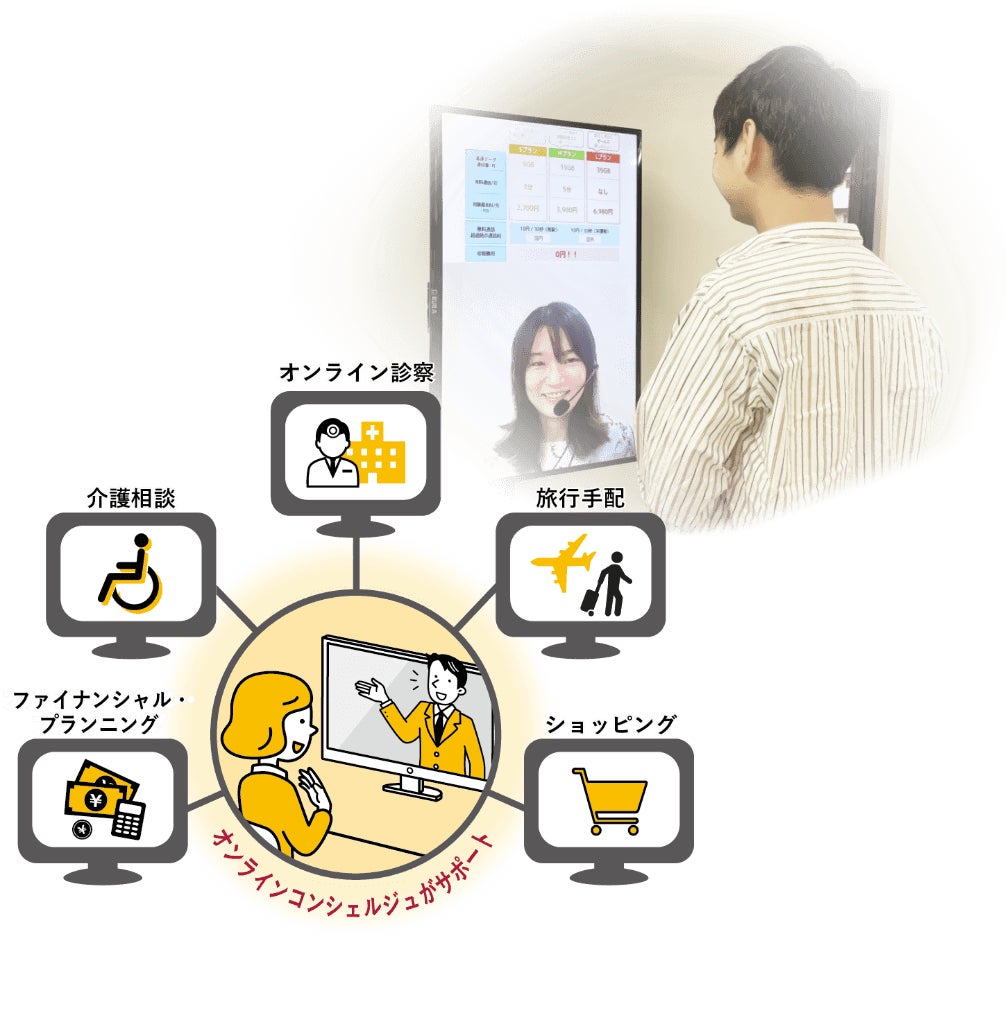 利用にあたって用意するのは、専用端末付きのモニターのみです。モニター前に来れば人感センサーが反応し、モニター上にコンシェルジュが現れます。あとは、コンシェルジュがあなたの要望をお伺いの上、オンライン診療や介護相談、買い物代行などさまざまなオンライン対面サービスにおつなぎします。