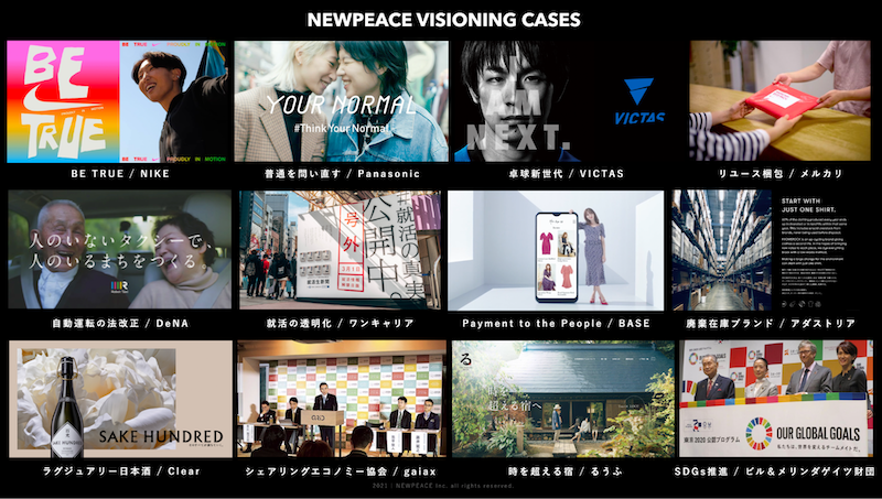 その後、SDGsやESG投資、パーパスなどが日本でも浸透しはじめると同時にSNSが一般化し、ジェンダーや気候変動、人種問題などのソーシャルイシューへの企業の対応が議論されるようになりました。その流れが加速するなかで、ニューピースは過去起点のブランディングではなく、未来起点のビジョニングを掲げ、様々な企業やブランドと社会に向けたアクションに取り組んできました。