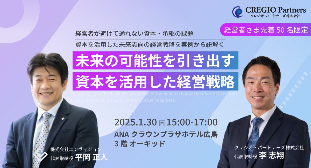 今回のセミナーでは、エンヴィジョン社の資本提携の実例を元に、未来の可能性を引き出す資本を活用した経営戦略の重要性についてお伝えします。