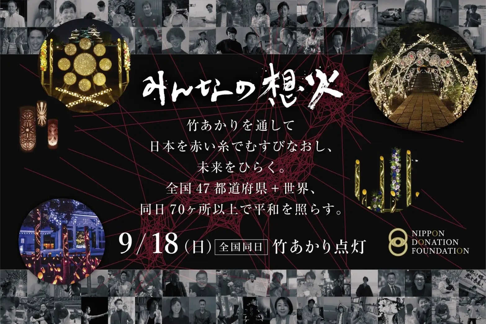 「むすぶ、ひらく。」をテーマに2022年9月18日の夜、全国47都道府県世界同日70ヶ所以上で世界平和を願って「竹あかり」を同日点灯し、地域の垣根を超えたまちづくりネットワークを醸成する「みんなの想火」プロジェクト。そんな<世界最大の竹あかりの祭典>の実施に向けて800万円目標のクラウドファンディングに挑戦し、425人のみなさまから総額833万円ものご支援をいただきました。実施日本全国での点灯+オンラインでの全国配信へ向け、各地でプロジェクトを本格始動してまいります!本プロジェクトは⼀般財団法⼈⽇本寄付財団・2022年度助成事業の助成をいただいています。