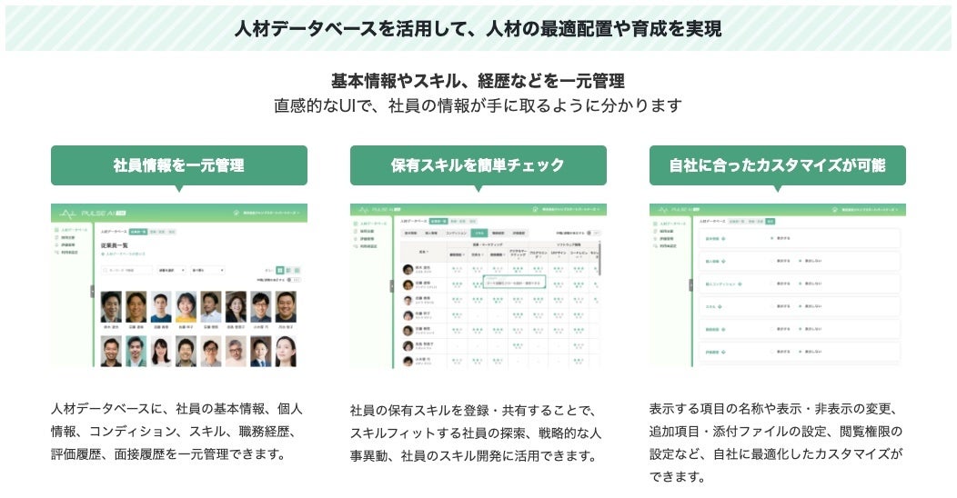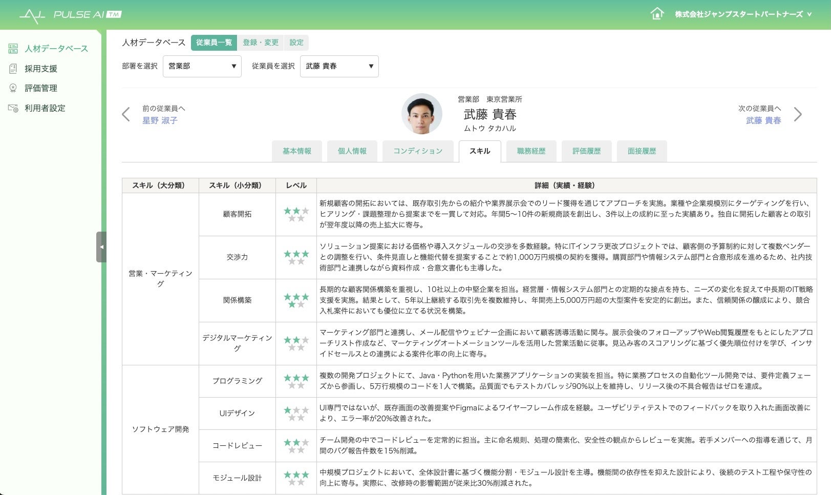 株式会社ジャンプスタートパートナーズ(本社:神奈川県横浜市、代表取締役:安藤 達裕)は、離職防止・成長支援・採用管理に役立つ組織改善ツール「PULSE AI(パルスアイ)」をさらに便利にする「人材データベース機能」の提供を開始したことをお知らせします。人材データベース機能では、社員の基本情報、個人情報、個人コンディション、スキル、職務経歴、評価履歴、面接履歴の最大7種類の人材情報を管理・共有することができ、人材の最適配置と社員の成長支援を実現します。