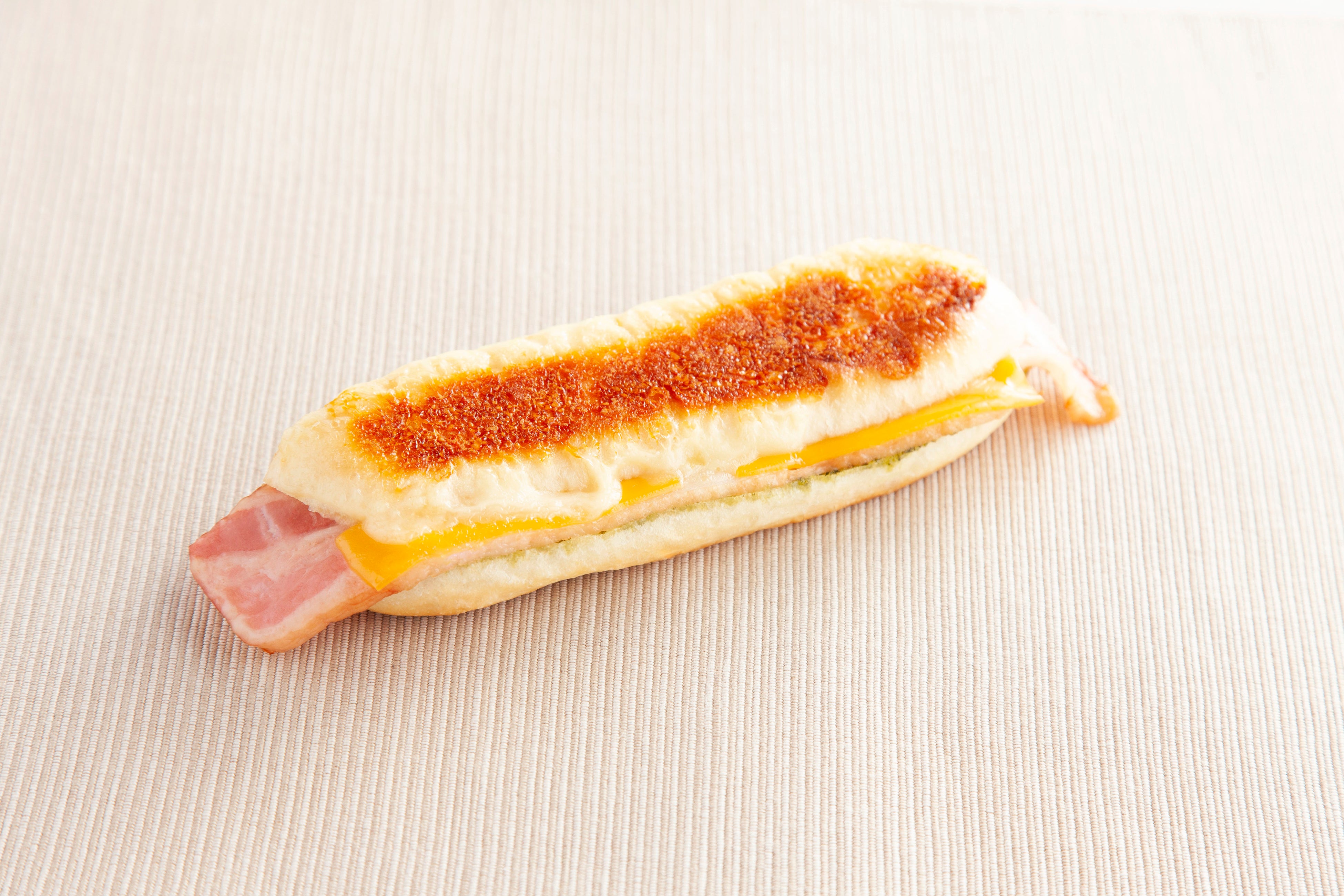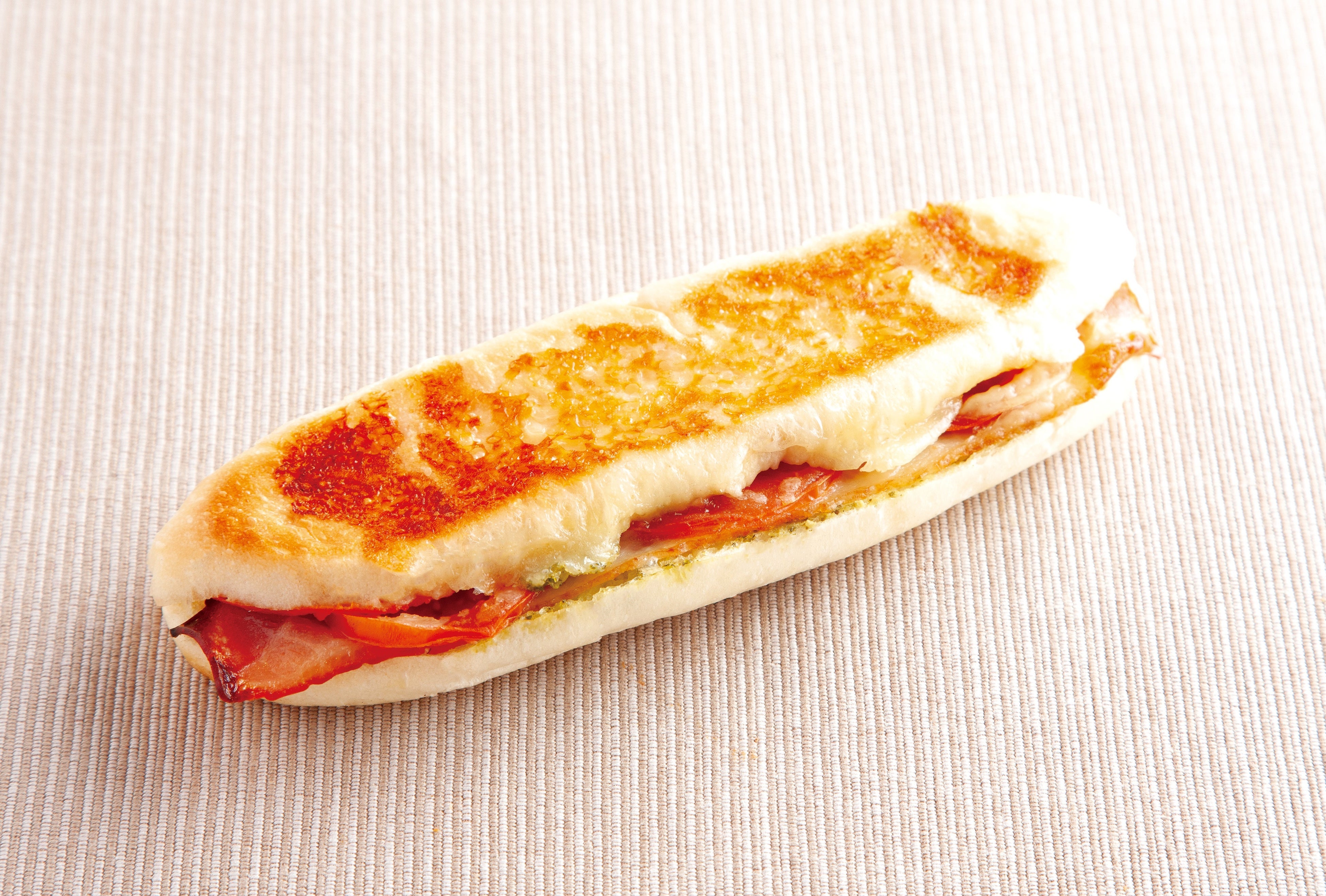 パンにバジルペーストを塗り、ボリューム満点の大きな厚切りベーコンをチーズと一緒にサンド。塩味が効いたベーコンととろけたチーズが相性抜群のパニーニ。
